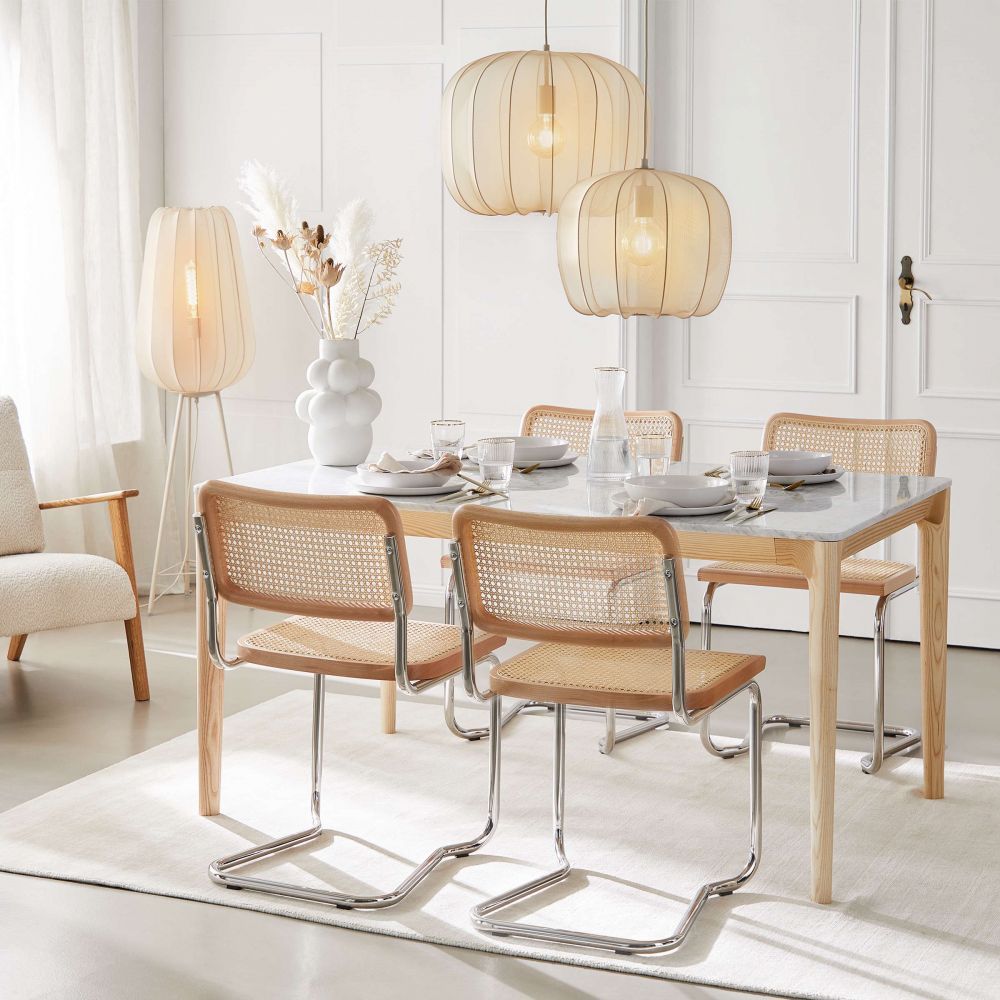 Μια πινελιά υπερβολής περιβάλλει το μοντέρνο κρεμαστό φωτιστικό AMAL. Το αμπαζούρ του καλύπτεται με ένα διαφανές διχτυωτό ύφασμα, το οποίο καλύπτει το κυρτό σιδερένιο πλαίσιο. Αυτός ακριβώς ο συνδυασμός αποκλειστικού σχεδιασμού και επιλογής υλικών υψηλής ποιότητας είναι που δίνει στο φωτιστικό μια σχεδόν μυστηριώδη εμφάνιση. Διατίθεται ως κρεμαστό φωτιστικό σε δύο μεγέθη σε κρεμ και μαύρο, καθώς και ως ασορτί φωτιστικό δαπέδου και επιτραπέζιο φωτιστικό.