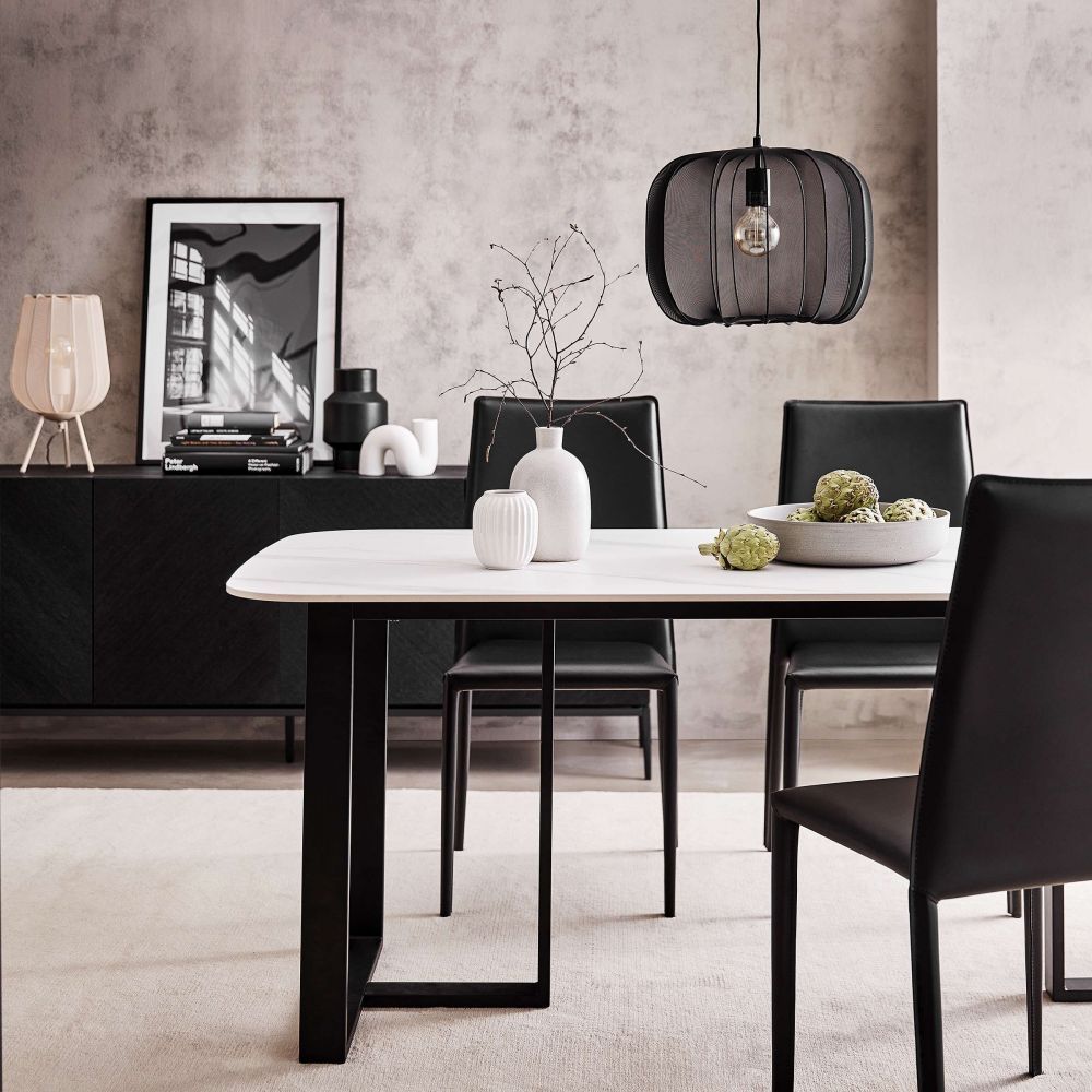 Μια πινελιά υπερβολής περιβάλλει το μοντέρνο κρεμαστό φωτιστικό AMAL. Το αμπαζούρ του καλύπτεται με ένα διαφανές διχτυωτό ύφασμα, το οποίο καλύπτει το κυρτό σιδερένιο πλαίσιο. Αυτός ακριβώς ο συνδυασμός αποκλειστικού σχεδιασμού και επιλογής υλικών υψηλής ποιότητας είναι που δίνει στο φωτιστικό μια σχεδόν μυστηριώδη εμφάνιση. Διατίθεται ως κρεμαστό φωτιστικό σε δύο μεγέθη σε κρεμ και μαύρο, καθώς και ως ασορτί φωτιστικό δαπέδου και επιτραπέζιο φωτιστικό.
