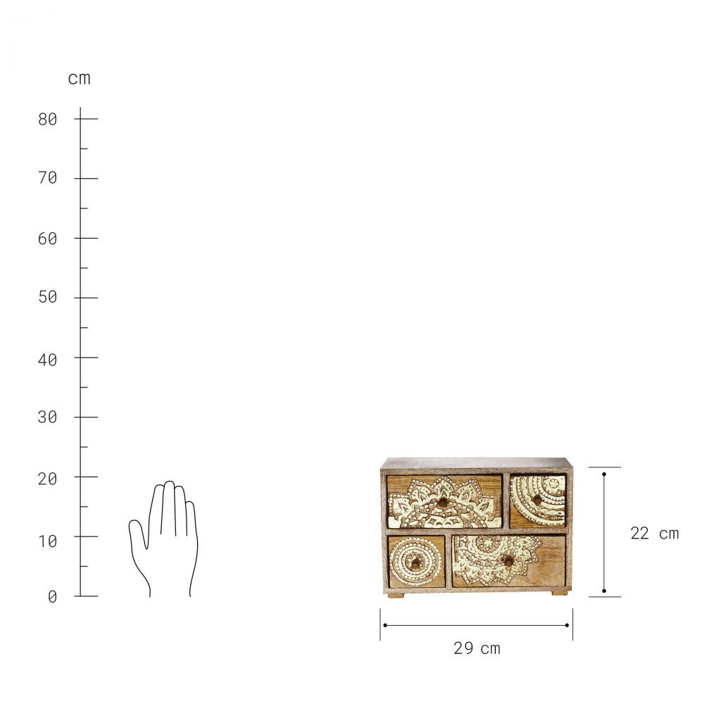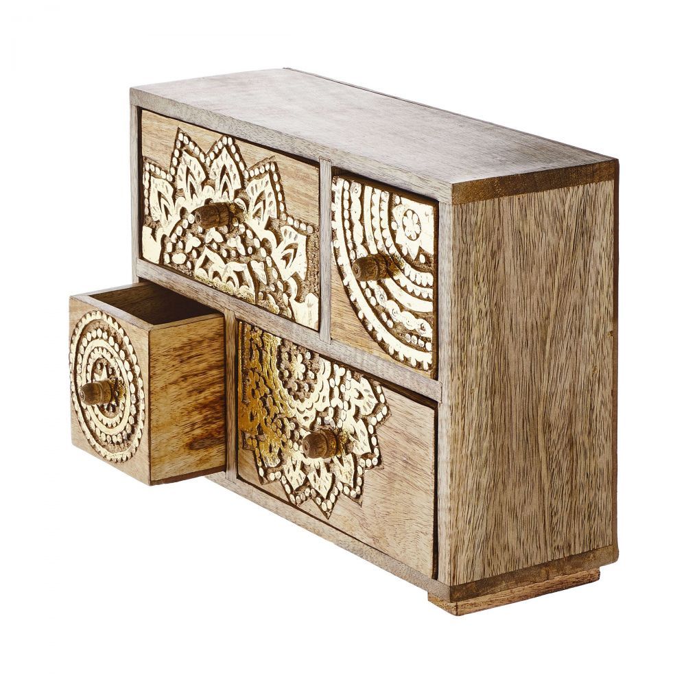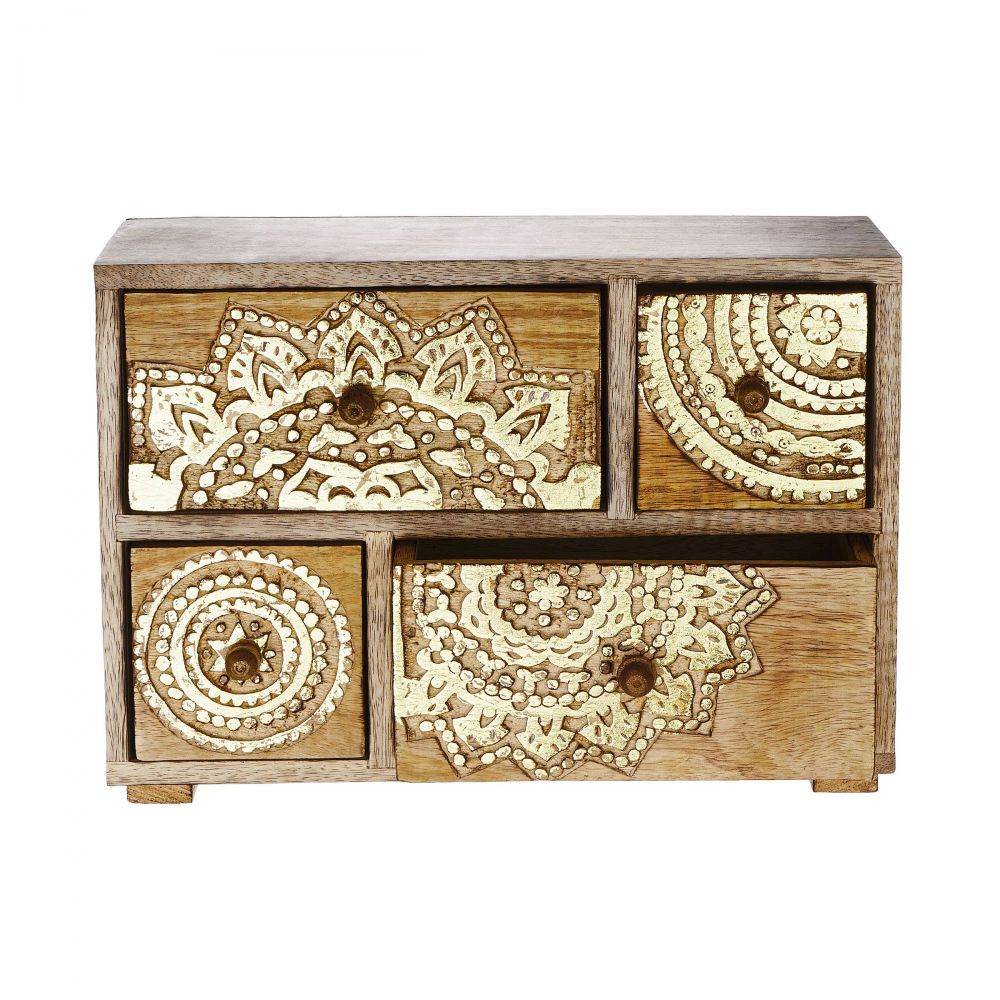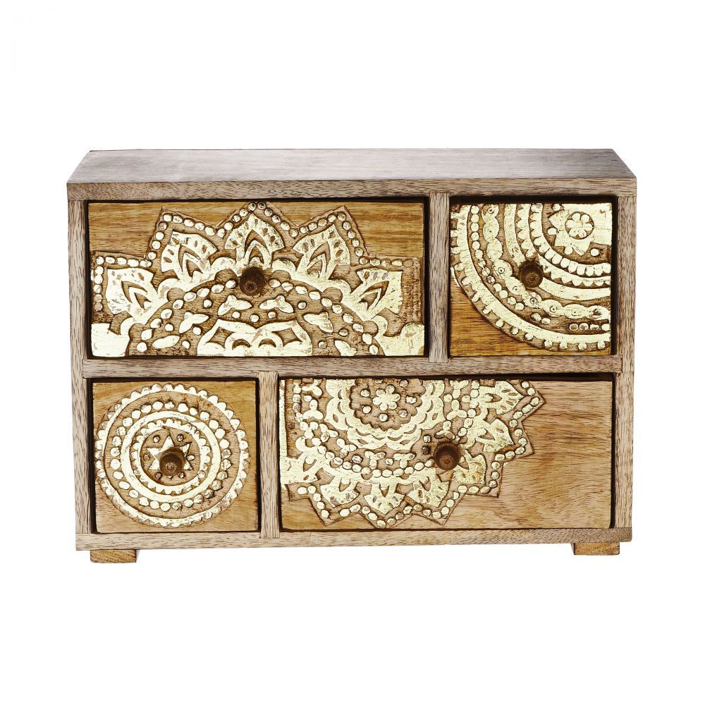 Μικρή αλλά συμπαγής: Η διακοσμητική συρταριέρα BALI από ξύλο mango με σκαλίσματα σε χρυσό χρώμα μπορεί να τοποθετηθεί πάνω σε βοηθητικό τραπέζι ή στο κομοδίνο ως ένα μικρό μπαούλο θησαυρού. Έτσι, έχετε ένα εντυπωσιακό στοιχείο, φιλικό προς το περιβάλλον που αντανακλά την αγάπη σας για τη λεπτομέρεια.