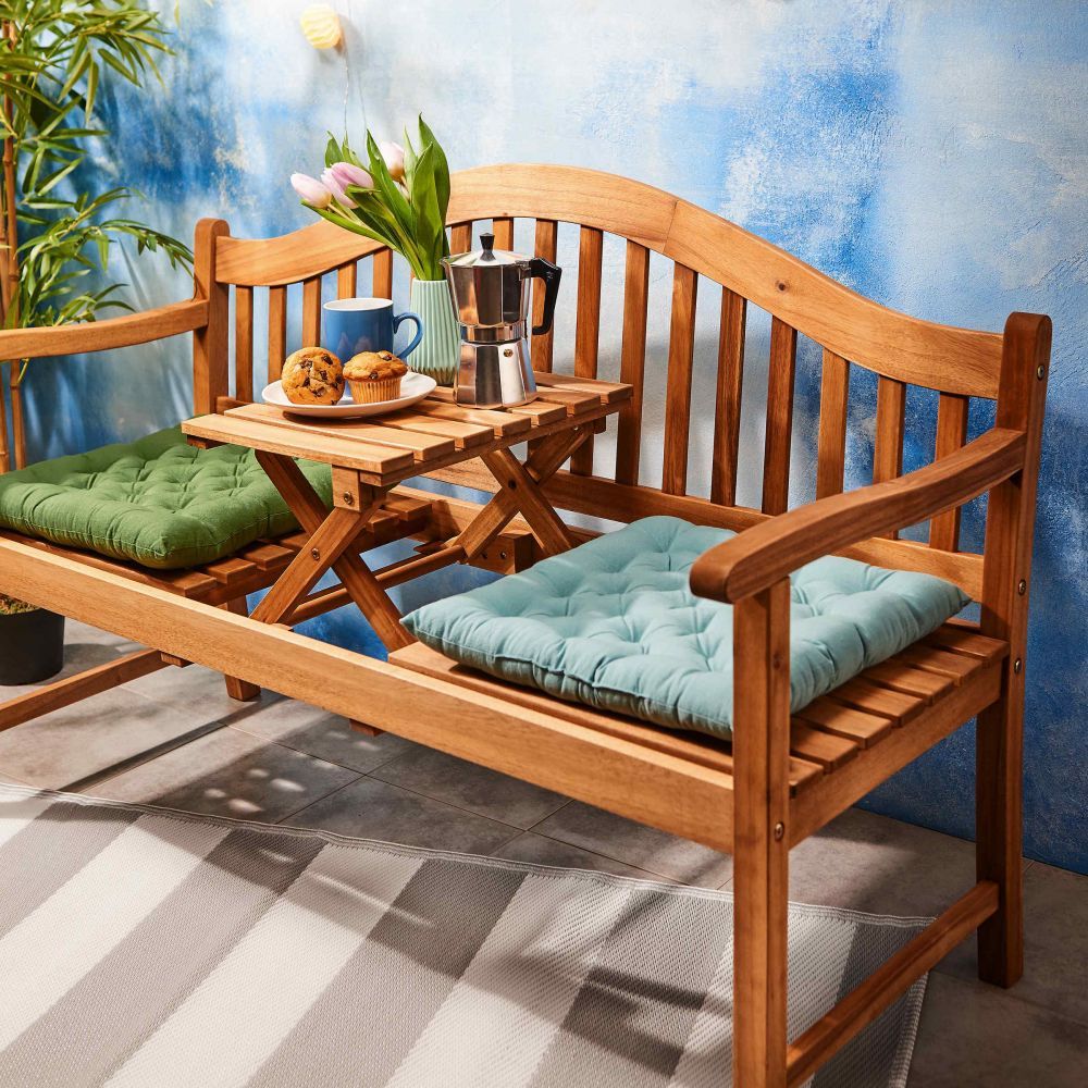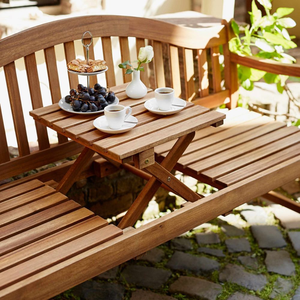 Καθίστε στο παγκάκι, βλέποντας την ανατολή ή το ηλιοβασίλεμα, τοποθετώντας ίσως το πρωινό σας φλιτζάνι καφέ ή το ποτήρι κόκκινο κρασί σας στο πτυσσόμενο τραπέζι από το παγκάκι κήπου BANQUETTE, κατασκευασμένο από πιστοποιημένο FSC ξύλο ακακίας και απολαύστε την παρέα συζητώντας τις απόψεις σας για τον κόσμο. Κλασσικό σχήμα με καμπυλωτή πλάτη, με πτυσσόμενο τραπέζι, κατάλληλο για 3 άτομα. Συμβουλή: Μπορεί να διακοσμηθεί με μαξιλάρια για ακόμη πιο όμορφο αποτέλεσμα.