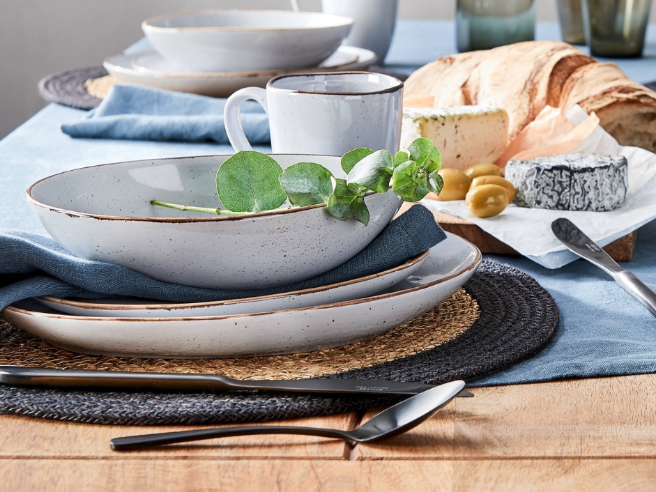 Δώστε βάθος στο τραπέζι σας χρησιμοποιώντας layering: πιάτα βάσης, κανονικά πιάτα και μπολ σε συνδυασμό. Προσθέστε υφασμάτινες πετσέτες δεμένες χαλαρά ή με ένα μικρό διακοσμητικό στοιχείο, όπως ένα κλαδάκι λεβάντας.