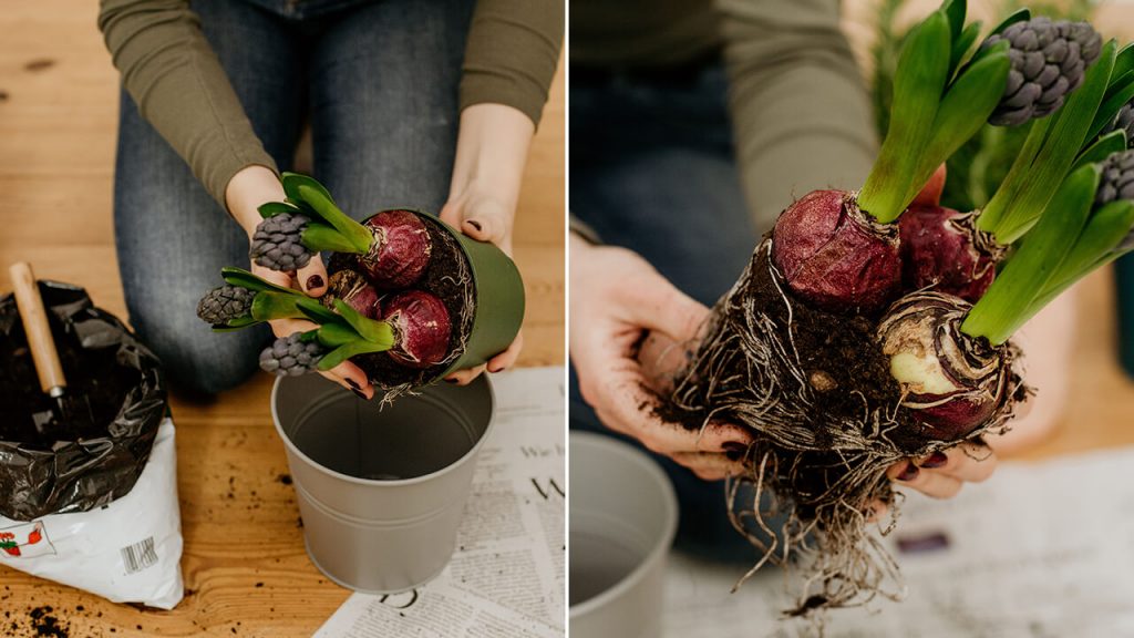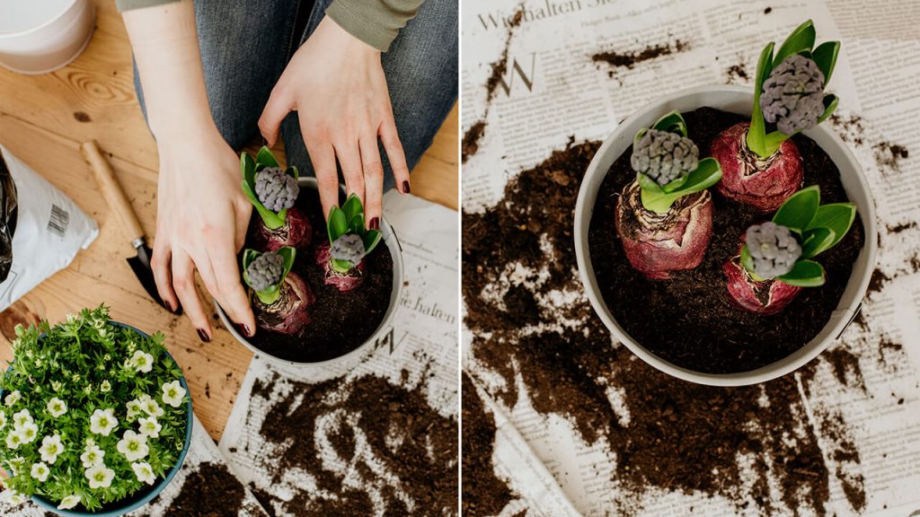 Πιέστε ελαφρά το χώμα προς τα κάτω, ώστε τα φυτά να παραμείνουν σταθερά! Συμπληρώστε χώμα πάνω από το φυτό έτσι ώστε να τροφοδοτείται από όλες τις πλευρές και από πάνω. Στην περίπτωση των υάκινθων ή των νάρκισσων, ωστόσο, οι βολβοί δεν πρέπει να καλύπτονται πλήρως αλλά να μένει ο μισός βολβός ελεύθερος από χώμα. Πιέστε ελαφρά με τα δάχτυλα, ώστε τα φυτά και τα λουλούδια να έχουν ασφαλή βάση και να μην κρεμούν και να λυγίζουν ακόμη και σε άνεμο.