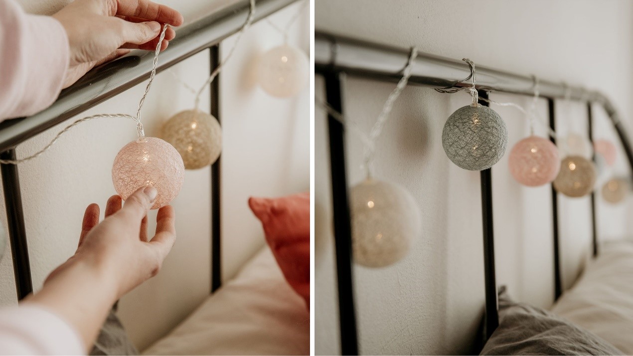 Οι φωτεινές αλυσίδες με υφασμάτινες μπάλες διαχέουν απαλά το φως. Απλώς τυλίξτε τις γύρω από ένα πλαίσιο και είστε έτοιμοι!