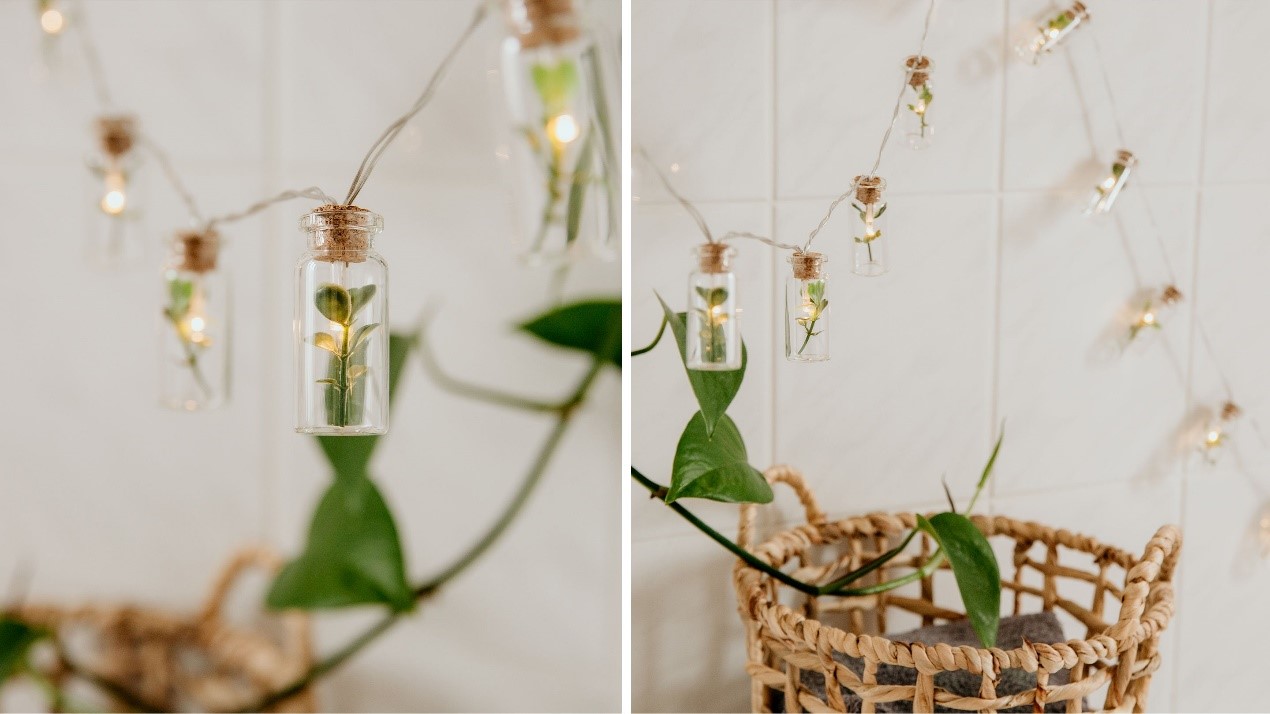 Ποιος είπε ότι τα διακοσμητικά λαμπάκια δε δείχνουν υπέροχα στο μπάνιο; Ειδικά όταν πρόκειται για μία φωτεινή αλυσίδα με βαζάκια που κρύβουν μικρά φυτά, δημιουργώντας μία πράσινη όαση.