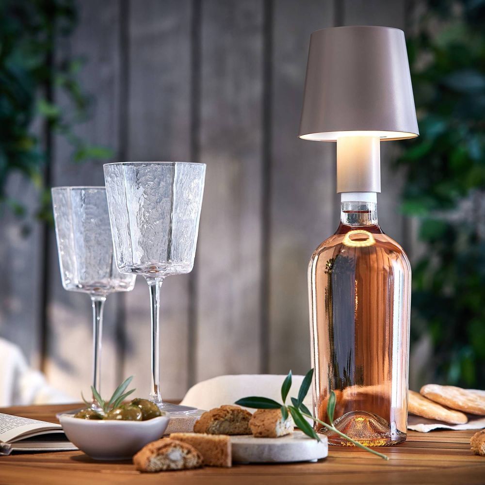 Το πρακτικό και κομψό φωτιστικό BOTTLE LIGHT με LED είναι πάντα διαθέσιμο όταν θέλετε λίγο ατμοσφαιρικό φωτισμό τα καλοκαιρινά βράδια. Με το φωτιστικό σε σχήμα αμπαζούρ με φόρτιση USB, μπορείτε να μετατρέψετε ένα μπουκάλι σε φωτιστικό σε χρόνο μηδέν: Απλώς τοποθετήστε το σε ένα μπουκάλι κρασιού ή άλλου τύπου μπουκάλι με λαιμό και απολαύστε το ζεστό φωτισμό.
