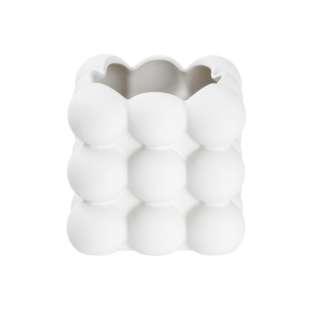 Λατρεύουμε αυτό το ιδιαίτερο σχήμα στα κεριά και έτσι δημιουργήσαμε το τετράγωνο κασπό BUBBLE. Το μικρό κεραμικό κασπό σε λευκό χρώμα μοιάζει σαν να αποτελείται από μεμονωμένες μπάλες και τραβάει την προσοχή ως διακοσμητικό στοιχείο π.χ. στο στρωμένο τραπέζι.