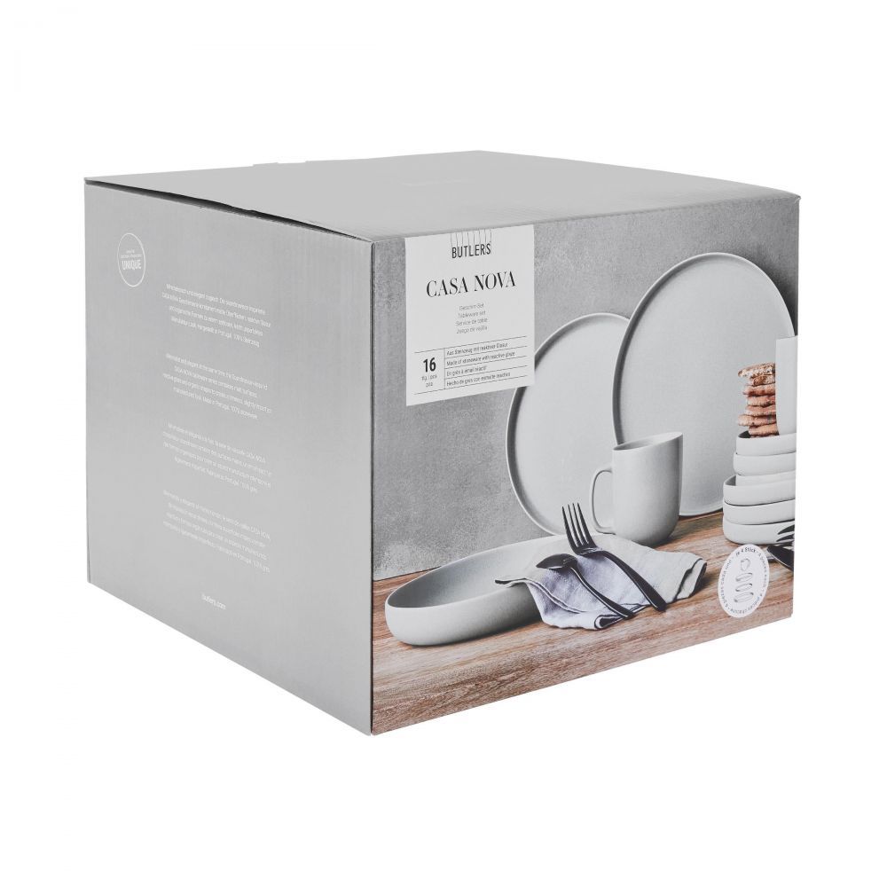 Εδώ, ο μινιμαλιστικός σχεδιασμός τονίζει αποτελεσματικά την ποιότητα: Το κεραμικό σετ 16 τεμαχίων CASA NOVA κατασκευάστηκε με αγάπη στην Πορτογαλία. Η ιδιαίτερη εμφάνιση αντανακλάται στον μοναδικό χαρακτήρα του αντιδραστικού λούστρου και στο ελαφρώς ατελές, οργανικό σχήμα. Η σκανδιναβική σχεδίαση και η στιβαρή κατασκευή κάνουν τη σειρά επιτραπέζιων σκευών CASA NOVA διαχρονική επιλογή με φυσική πινελιά. Τα σκεύη χαρακτηρίζονται από το ειδικό αντιδραστικό λούστρο με ιδιαίτερες χρωματικές διαβαθμίσεις. Διαθέσιμα σε γκρι και μαύρο χρώμα