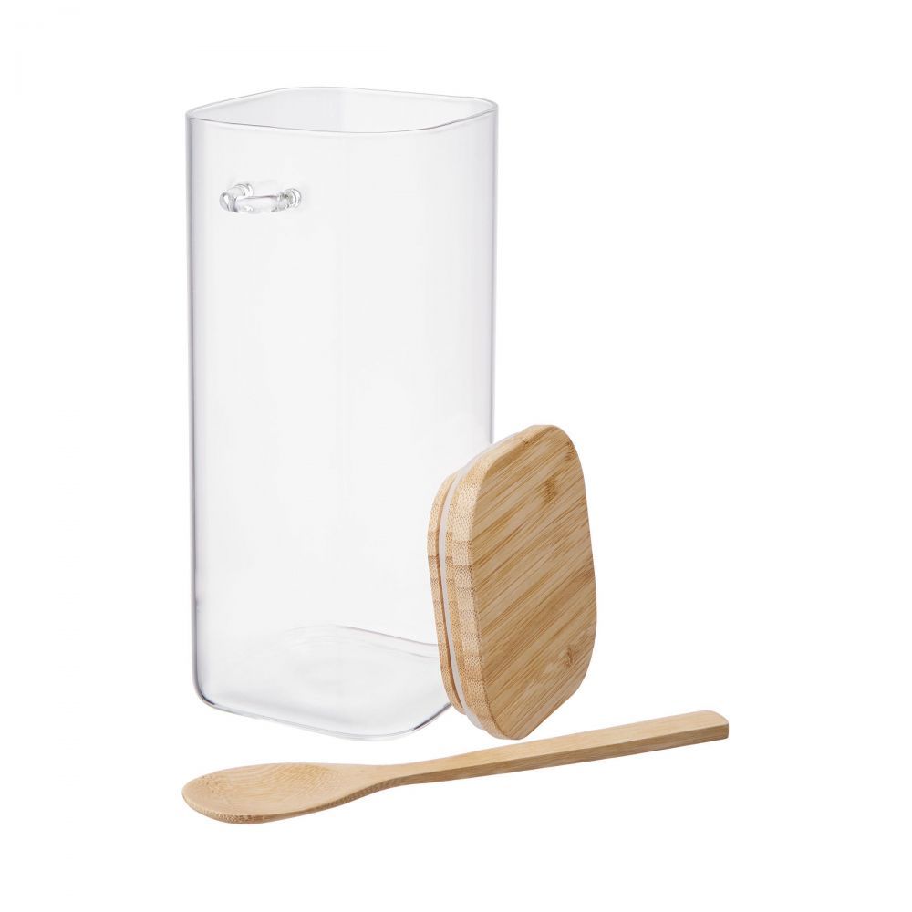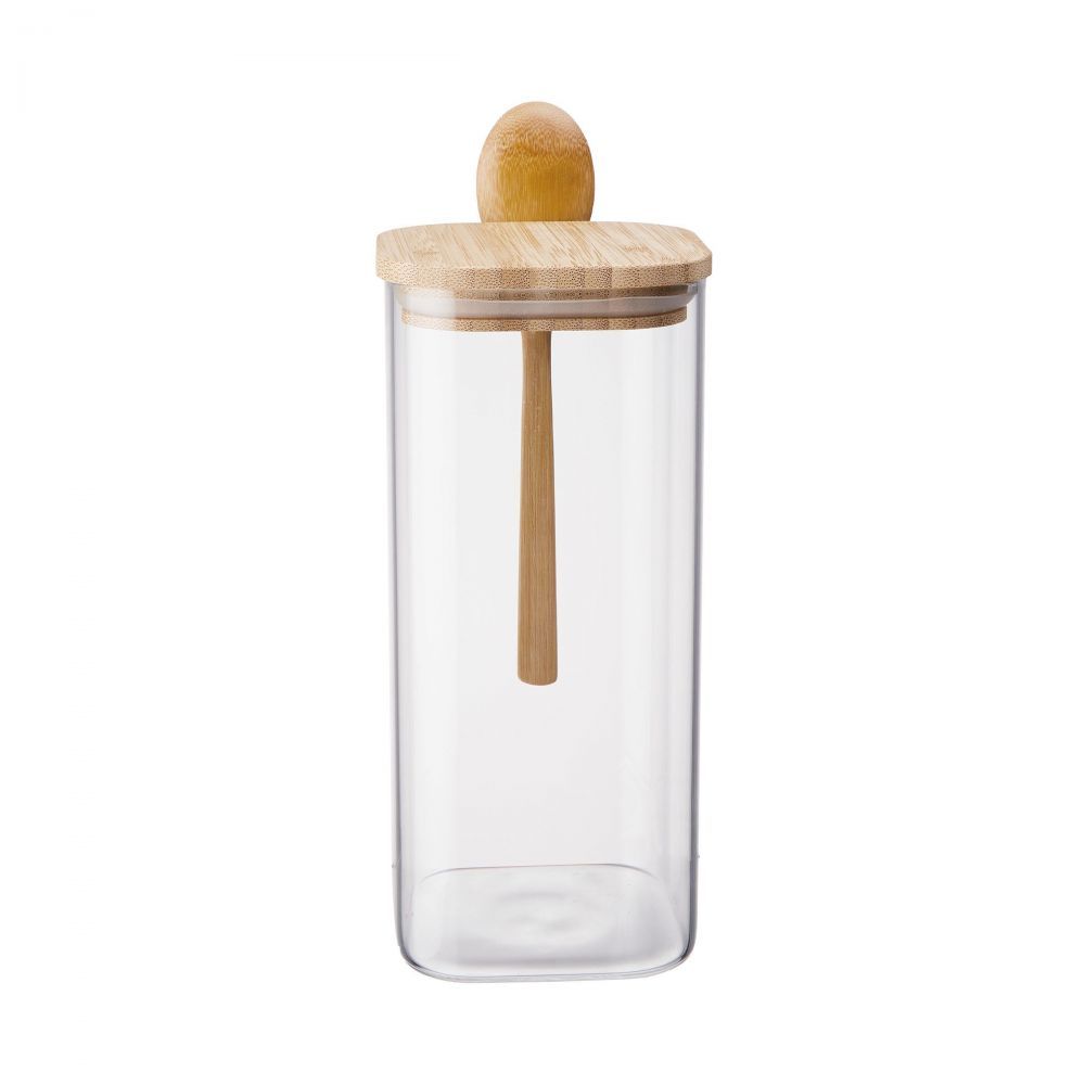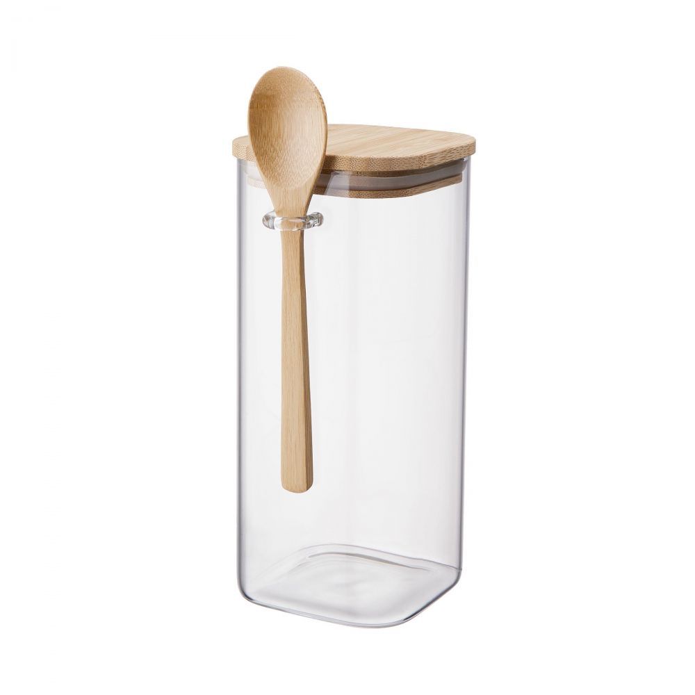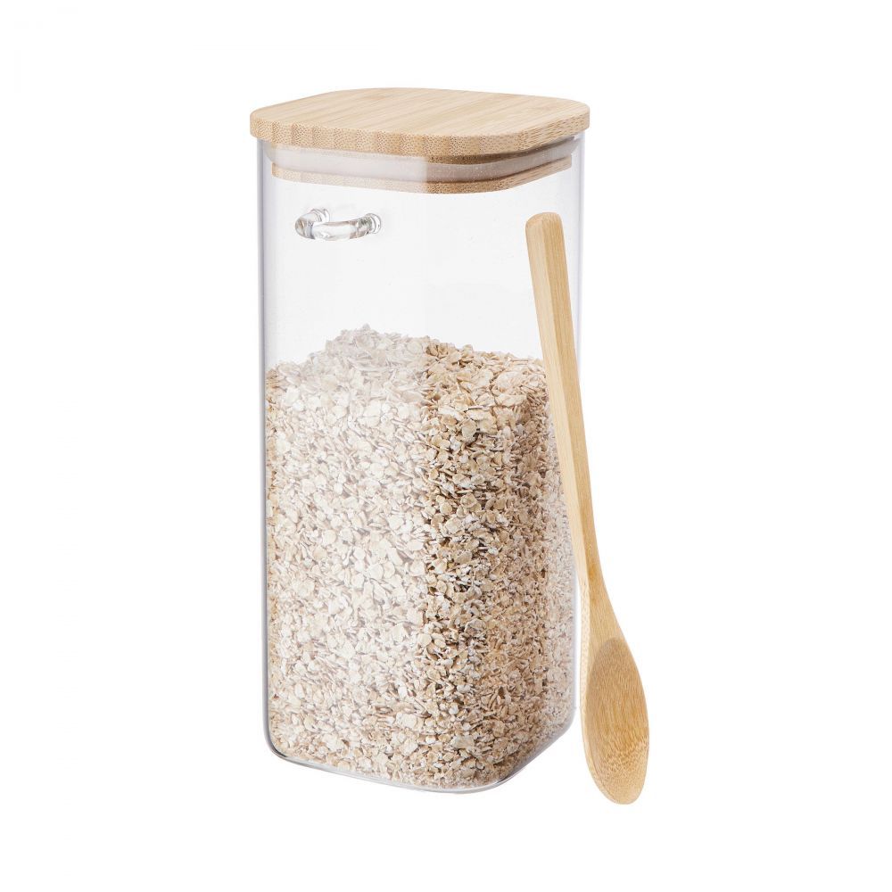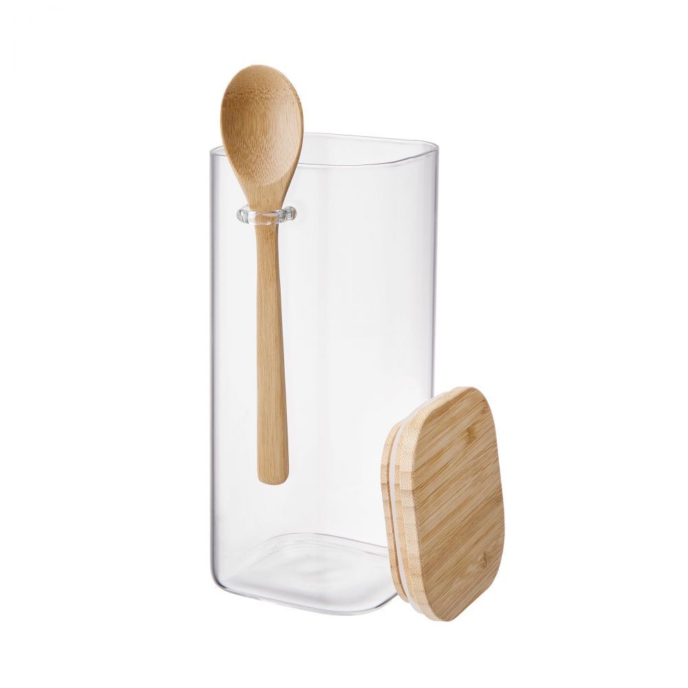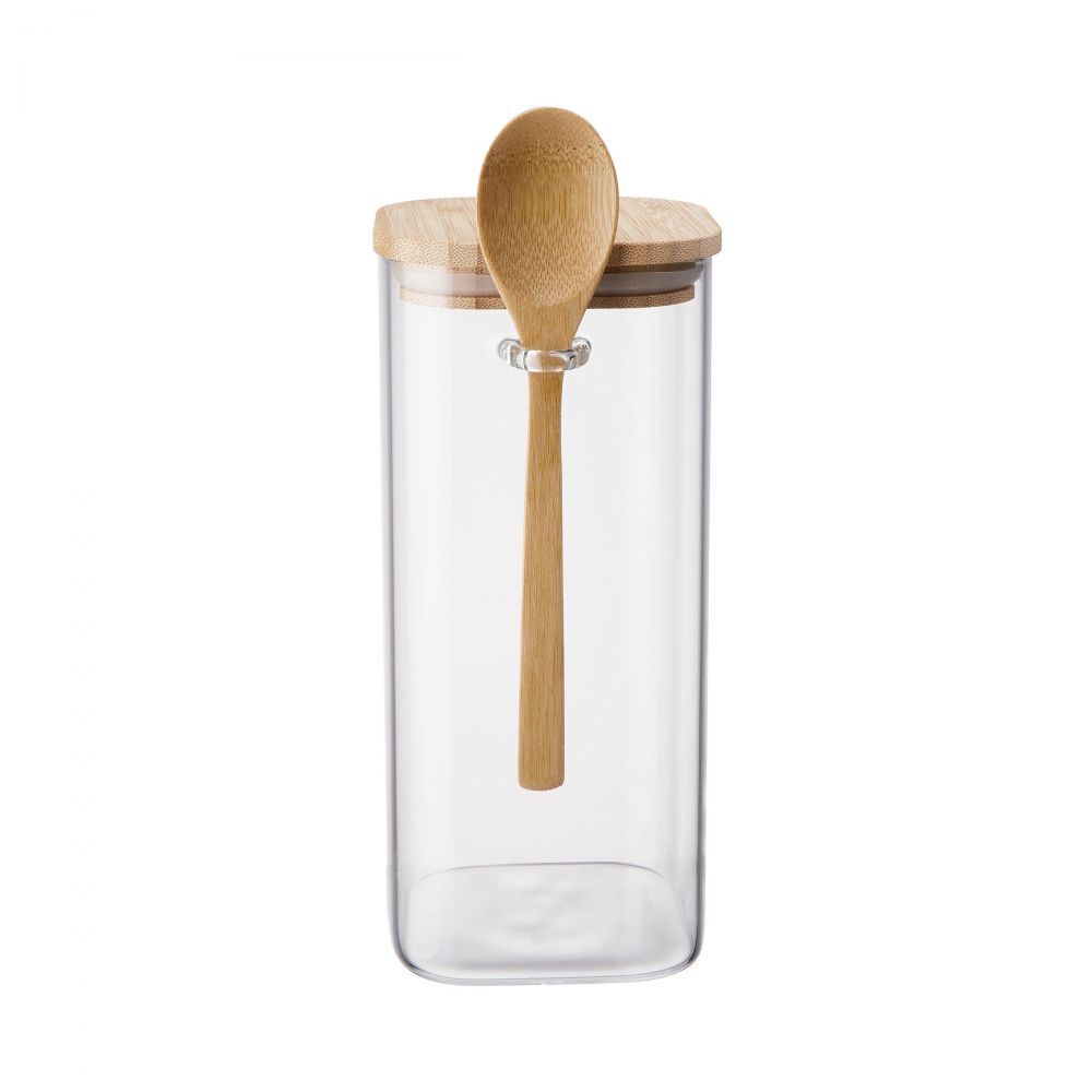 Αποθηκεύστε καφέ ή τσάι, βρώμη ή σπόρους chia: Στο βάζο COMPOSITION τα τρόφιμα αποθηκεύονται με ασφάλεια μέχρι να έρθει η ώρα να μαγειρέψετε, να ετοιμάσετε ένα ρόφημα ή ένα σνακ. Το μοντέρνο βάζο αποθήκευσης είναι κατασκευασμένο από στιβαρό γυαλί, κλείνει αεροστεγώς χάρη στο ξύλινο καπάκι με δακτύλιο σιλικόνης, και περιλαμβάνει ένα ξύλινο κουτάλι. Είναι πρακτικό αλλά και διακοσμητικό για τον πάγκο της κουζίνας σας.