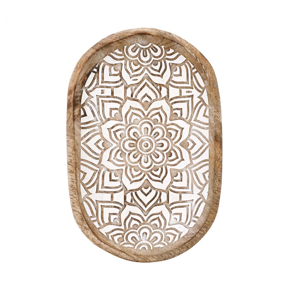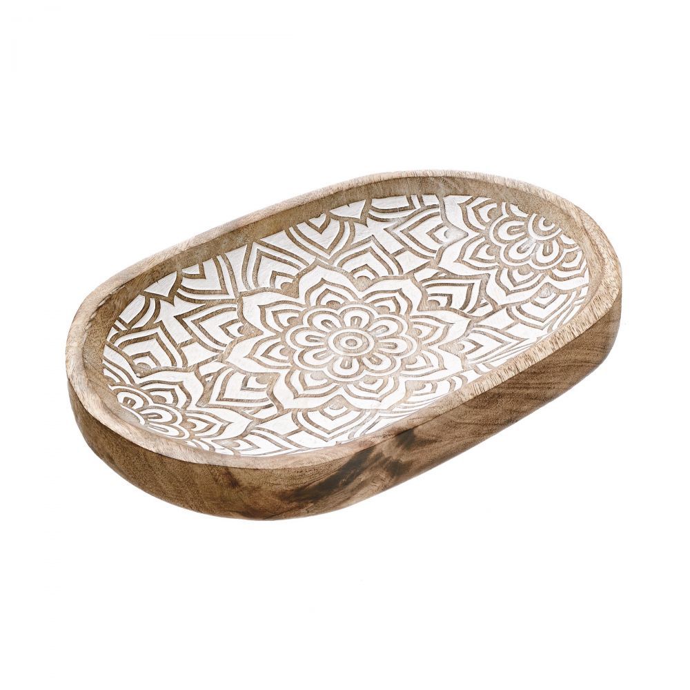 Λεπτά σκαλισμένα και λευκασμένα σχέδια διακοσμούν το μπολ FATIMA. Το διακοσμητικό μπολ είναι κατασκευασμένο από φυσικό ξύλο μάνγκο και μπορεί να χρησιμοποιηθεί, για παράδειγμα, στο διάδρομο ή στην κρεβατοκάμαρα ως εντυπωσιακό αξεσουάρ πάνω σε ένα βοηθητικό τραπέζι. Είναι επίσης ιδανικό σε συνδυασμό με ανατολίτικα φαναράκια ή βάζα.