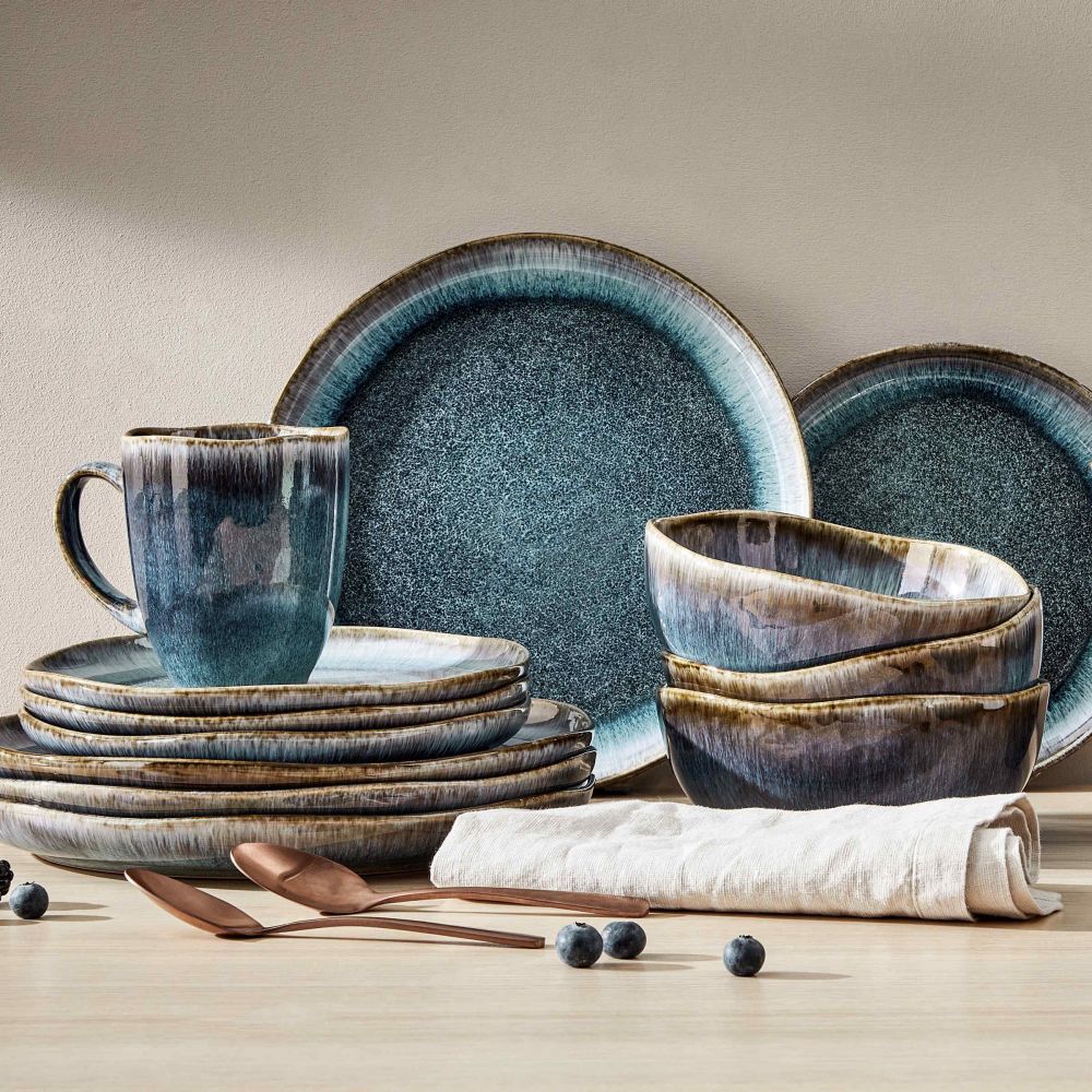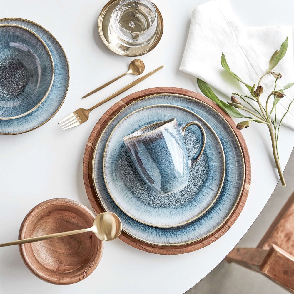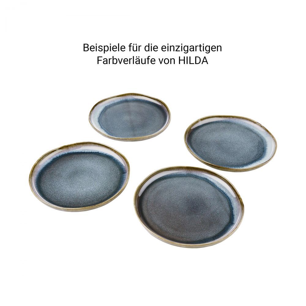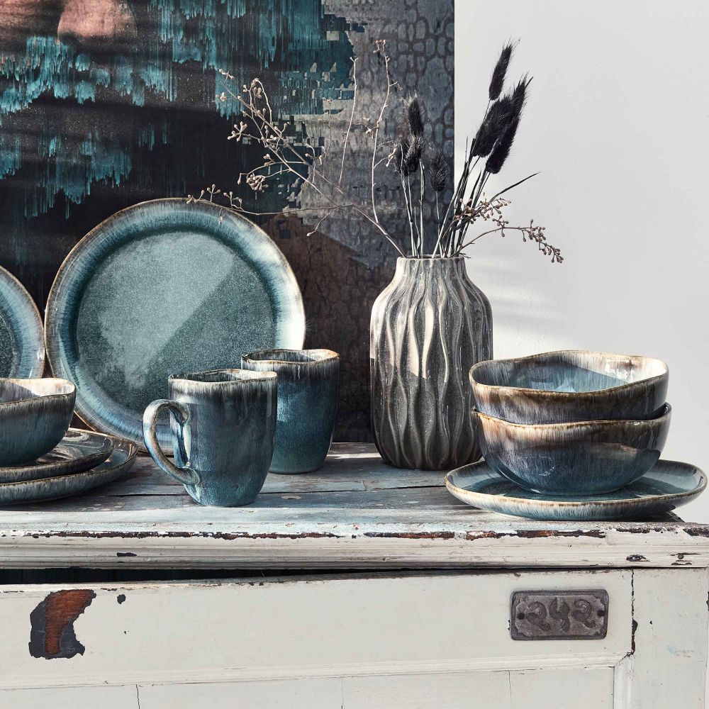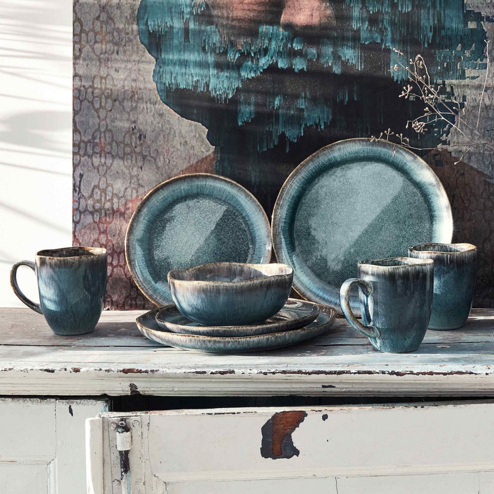 Όταν το αντιδραστικό λούστρο γίνεται έργο τέχνης: δεν μπορείτε να αντισταθείτε στο συναρπαστικά όμορφο σερβίτσιο 16 τεμαχίων HILDA. Οι ιριδίζουσες μπλε αποχρώσεις του θυμίζουν σκανδιναβικά φιόρδ και αλπικές λίμνες, ενώ το οργανικό του σχήμα μαρτυρά την εγγύτητα με τη φύση. Κάθε κομμάτι αυτής της μοναδικής σειράς πήλινων επιτραπέζιων σκευών είναι μοναδικό, και κάθε τραπέζι με πιάτα, μπολ και φλιτζάνια HILDA είναι μια πανδαισία για τα μάτια.