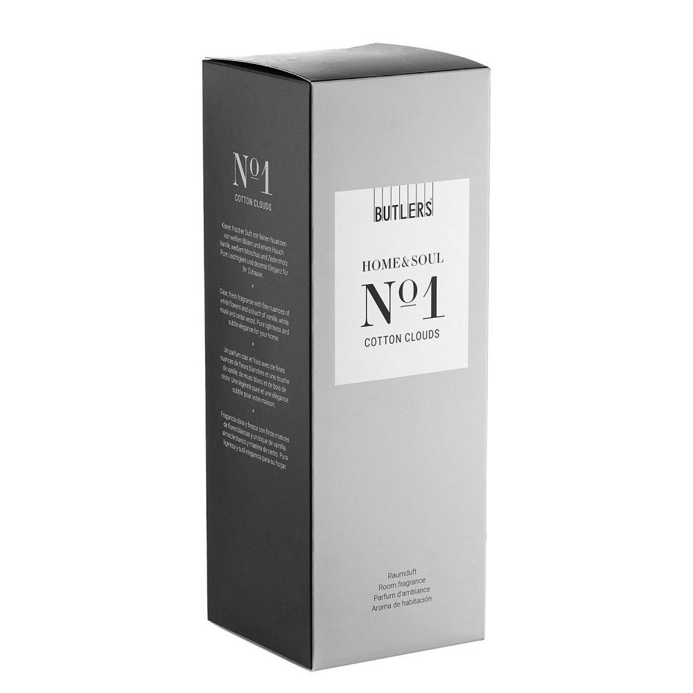 Απαλό, τρυφερό, ξέγνοιαστο: Το αρωματικό χώρου HOME & SOUL Cotton Clouds συνδυάζει βανίλια, τριαντάφυλλο και κρίνο της κοιλάδας με τα φρουτώδη, φρέσκα αρώματα μήλου, βερίκοκου και φυλλωδών λαχανικών. Για μια αίσθηση απεριόριστης ελαφρότητας. Διατίθεται και σε άλλο μέγεθος. Η Butlers έχει αιχμαλωτίσει μια ποικιλία αρωματικών εμπειριών για εσάς στα αρώματικά χώρου της σειράς HOME & SOUL. Εμπνευσμένα στην πρωτεύουσα των γαλλικών αρωμάτων, τη Γκρας, και προσεκτικά κατασκευασμένα στη Γερμανία, τα μπουκάλια γεμίζουν το σπίτι σας με μια αισθησιακή πινελιά από αρώματα φρέσκα, λουλουδάτα, αναζωογονητικά, πικάντικα ή σαγηνευτικά.