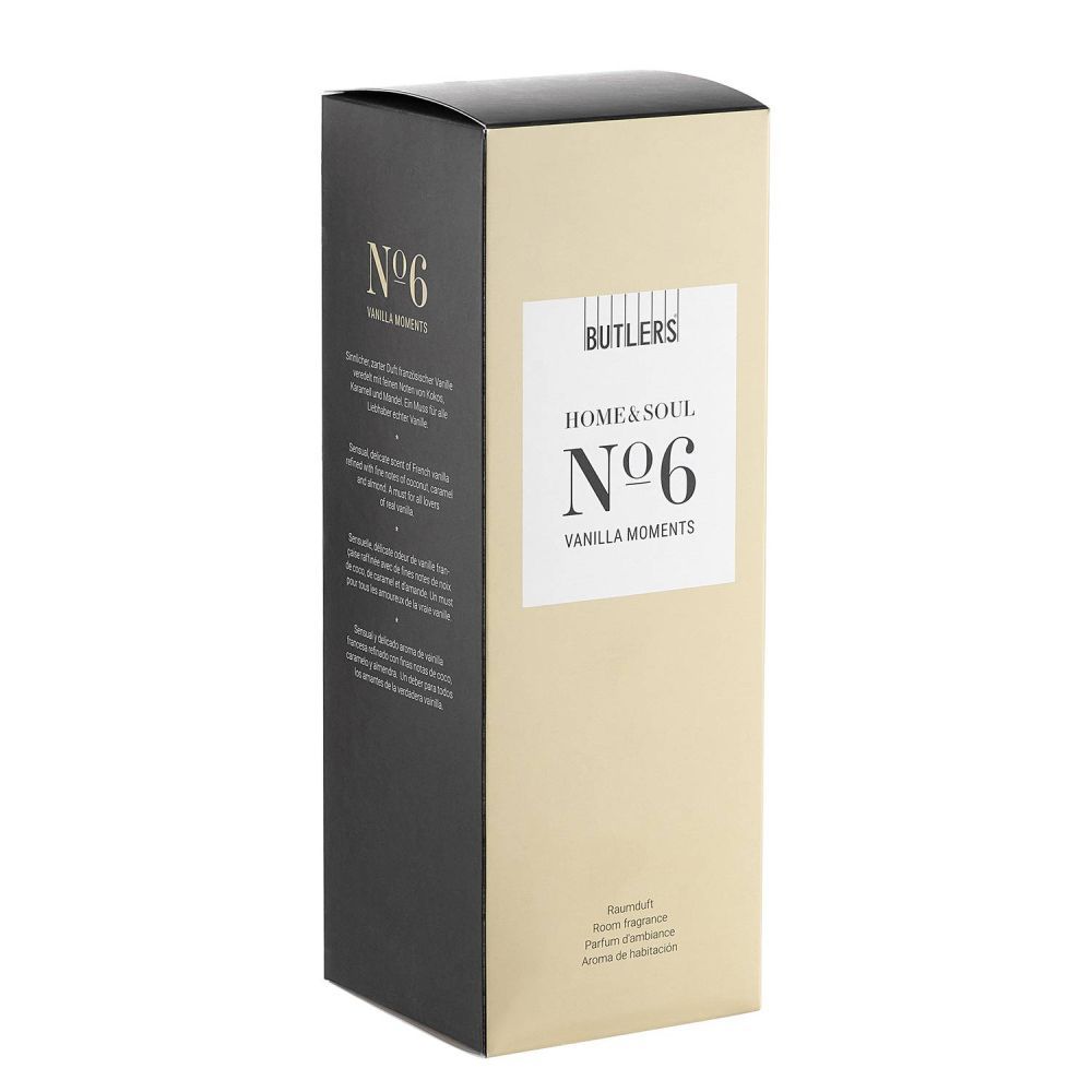 Άρωμα βανίλιας, ντελικάτων λουλουδιών και μούρων. Το αρωματικό χώρου HOME & SOUL Vanilla Moment συνδιάζει αυτά τα αρώματα με μια νότα βετιβέρ και φρέσκιας βρύας, δημιουργώντας μια αισθησιακή σύνθεση που ταιριάζει απόλυτα στο γούστο σας. Η Butlers έχει αιχμαλωτίσει μια ποικιλία αρωματικών εμπειριών για εσάς στα αρώματικά χώρου της σειράς HOME & SOUL. Εμπνευσμένα στην πρωτεύουσα των γαλλικών αρωμάτων, τη Γκρας, και προσεκτικά κατασκευασμένα στη Γερμανία, τα μπουκάλια γεμίζουν το σπίτι σας με μια αισθησιακή πινελιά από αρώματα φρέσκα, λουλουδάτα, αναζωογονητικά, πικάντικα ή σαγηνευτικά.
