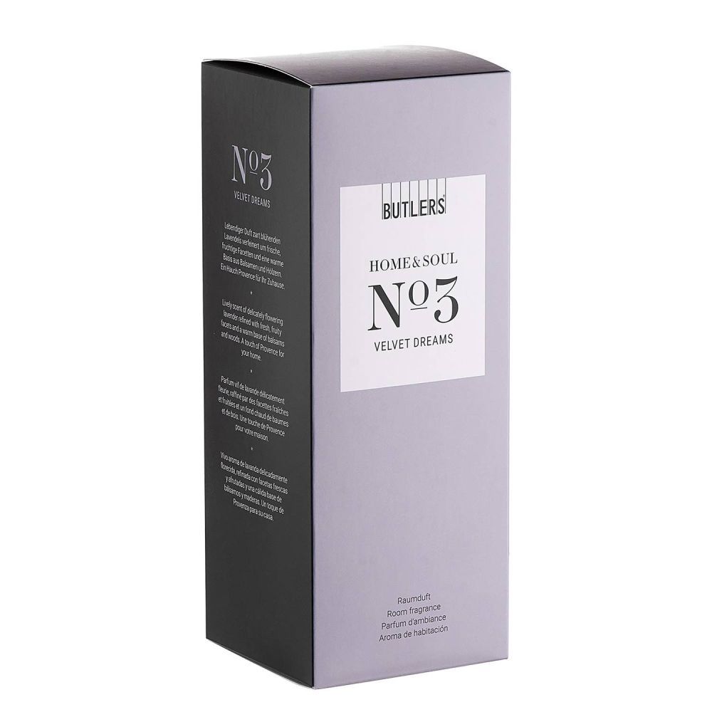 Πάρτε μια βαθιά ανάσα: Το αρωματικό χώρου HOME & SOUL Velvet Dreams συνδυάζει την ηρεμιστική επίδραση της λεβάντας με αναζωογονητικές νότες πράσινης μέντας και πικάντικων συστατικών που φέρνουν διαύγεια κι αρμονία στις αισθήσεις. Η Butlers έχει αιχμαλωτίσει μια ποικιλία αρωματικών εμπειριών για εσάς στα αρώματικά χώρου της σειράς HOME & SOUL. Εμπνευσμένα στην πρωτεύουσα των γαλλικών αρωμάτων, τη Γκρας, και προσεκτικά κατασκευασμένα στη Γερμανία, τα μπουκάλια γεμίζουν το σπίτι σας με μια αισθησιακή πινελιά από αρώματα φρέσκα, λουλουδάτα, αναζωογονητικά, πικάντικα ή σαγηνευτικά.