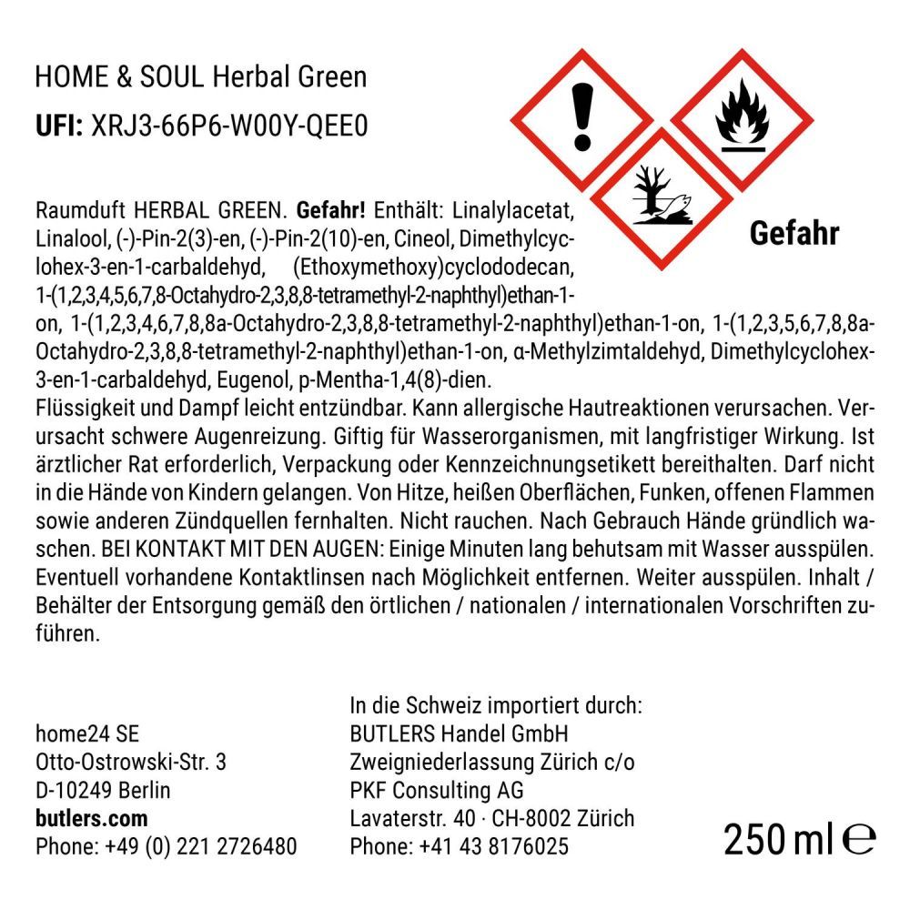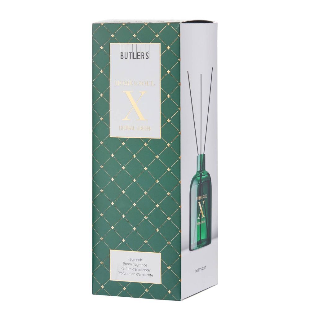 Το αρωματικό χώρου HOME & SOUL X Herbal green είναι ένα αρμονικό άρωμα με ξυλώδεις νότες πεύκου και έλατου, μια νότα φρέσκιας μέντας, ευκαλύπτου και πικάντικων βοτάνων. Σαν μια βόλτα σε ένα καθαρό χειμωνιάτικο πρωινό. Η Butlers έχει αιχμαλωτίσει μια ποικιλία αρωματικών εμπειριών για εσάς στα αρώματικά χώρου της σειράς HOME & SOUL. Εμπνευσμένα στην πρωτεύουσα των γαλλικών αρωμάτων, τη Γκρας, και προσεκτικά κατασκευασμένα στη Γερμανία, τα μπουκάλια γεμίζουν το σπίτι σας με μια αισθησιακή πινελιά από αρώματα φρέσκα, λουλουδάτα, αναζωογονητικά, πικάντικα ή σαγηνευτικά.
