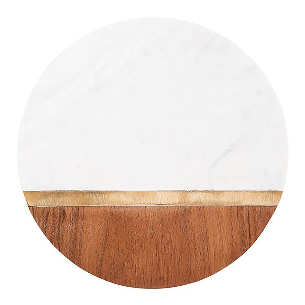 Όλα τα καλά πράγματα έρχονται σε σειρά: το ματ μάρμαρο, ο λαμπερός ορείχαλκος και η ζεστή αίσθηση του ξύλου ακακίας, συνδέονται κομψά σε αυτό τον στρογγυλό μαρμάρινο δίσκο κοπής. Εξαιρετικό αξεσουάρ για την κουζίνα που είναι το ιδανικό δώρο για εσάς και τους αγαπημένους σας.
