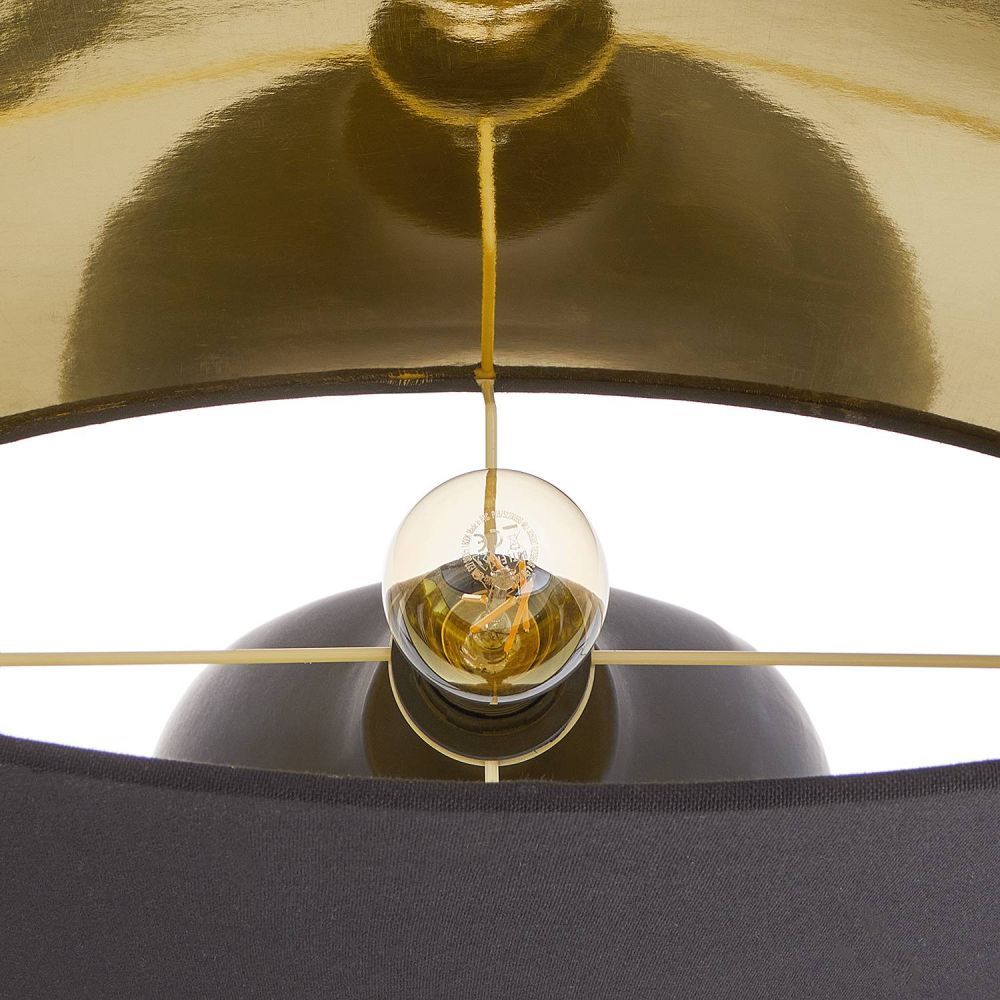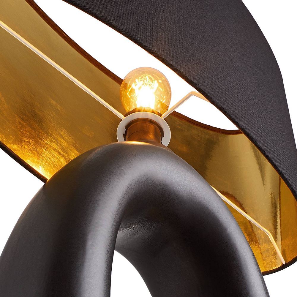 Το μαύρο δείχνει όμορφο με το επιτραπέζιο φωτιστικό MOOD. Η κεραμική βάση του φωτιστικού είναι σε μαύρο ματ χρώμα με τραχύ φινίρισμα και το καπέλο είναι κατασκευασμένο από μαύρο λινό ύφασμα με χρυσό εσωτερικό. Το σχήμα της βάσης αυτού του κομψού φωτιστικού θυμίζει γλυπτό. Στο τραπέζι ή σε μπουφέ, αυτό το φωτιστικό κάνει μια δικοσμητική δήλωση και ταυτόχρονα εκπέμπει ηρεμία.