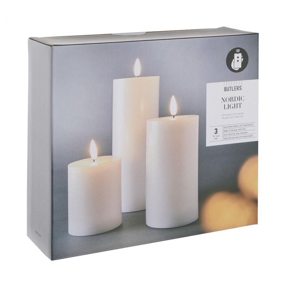 Καθήστε αναπαυτικά και παρακολουθήστε προσεκτικά το φως των κεριών. Είναι ό,τι πιο ξεκούραστο και χαλαρωτικό με τα διακοσμητικά κεριά NORDIC LIGHT LED (σετ 3 τεμαχίων, διαφορετικά μεγέθη): Χωρίς πραγματική φλόγα, τρεμοπαίζουν μόνιμα και όμορφα - ακόμη και σε ρεύματα αέρα και σε σημεία όπου δεν μπορείτε να ανάψετε αληθινά κεριά. Απλώς ανάψτε τα κεριά LED που λειτουργούν με μπαταρία με το τηλεχειριστήριο και απολαύστε το ατμοσφαιρικό εφέ του φωτός των κεριών.