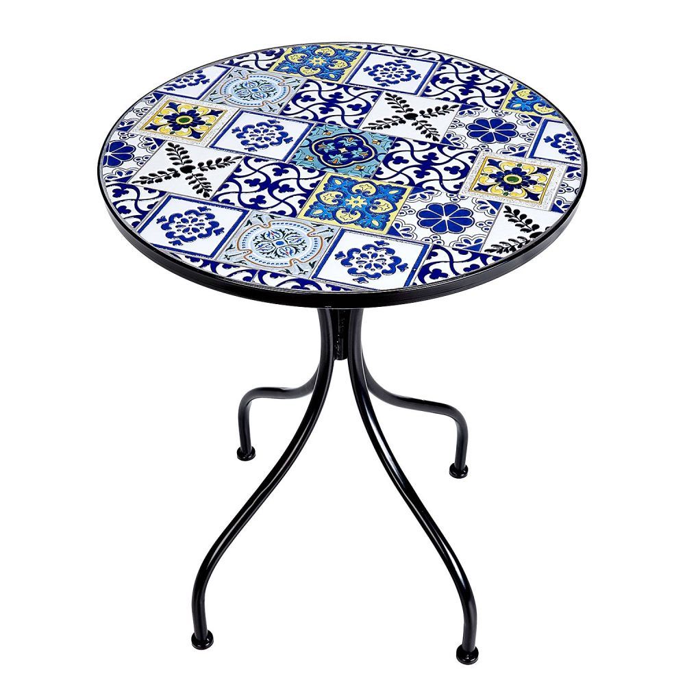 Τα Azulejos είναι δημοφιλή ισπανικά πλακάκια, καλλιτεχνικά διακοσμημένα υπό την επίδραση της μαυριτανικής κουλτούρας. Αυτό το όμορφο στυλ, με πολύχρωμα κεραμικά πλακίδια σε διάφορα σχέδια, αποτυπώνεται και στο στρογγυλό τραπέζι PALAZZO . Το πλαίσιο του τραπεζιού είναι κατασκευασμένο από σίδερο και τέσσερα πόδια εξασφαλίζουν τη σταθερότητά του. Μπορείτε να συνδυάσετε αυτό το κομψό τραπέζι με ξύλινες καρέκλες, ψάθινες πολυθρόνες ή μοντέρνα έπιπλα κήπου για να δημιουργήσετε τον δικό σας ζεστό χώρο στον ήλιο.