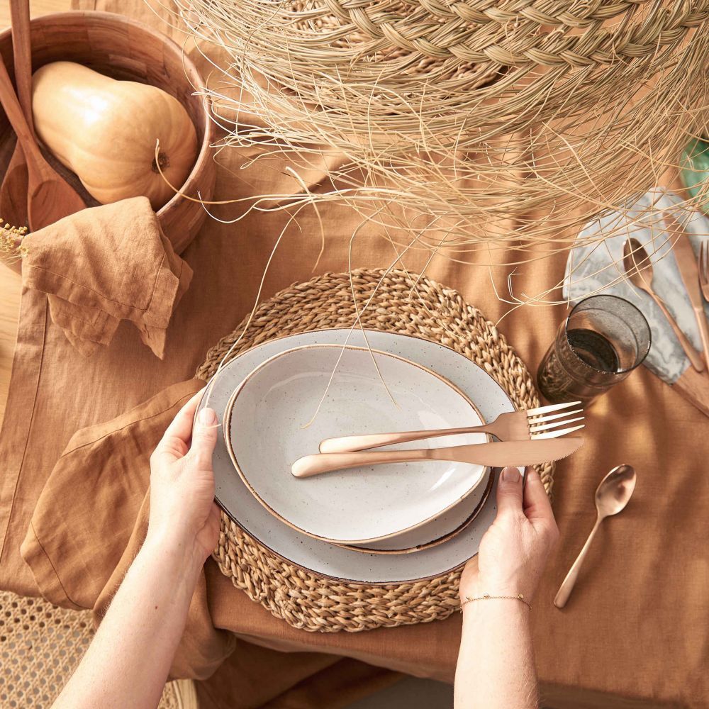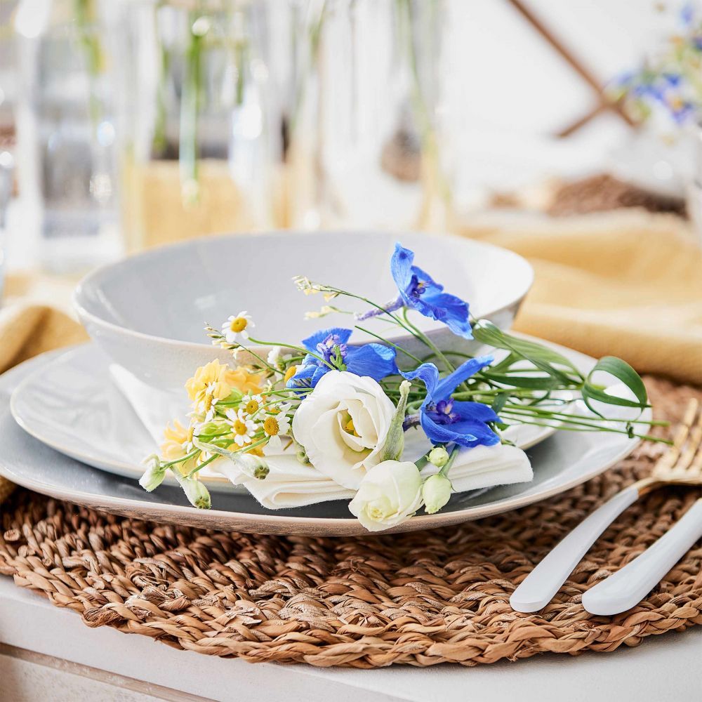 Η απόλυτη φυσικότητα: Με το σουπλά από φύκια και γρασίδι SEA BRAID, μπορείτε να καλύψετε το λευκό ξύλινο τραπέζι σας ή το τραπέζι κήπου για να σερβίρετε ένα ελαφρύ γεύμα και να απολαύσετε ένα όμορφο βράδυ.