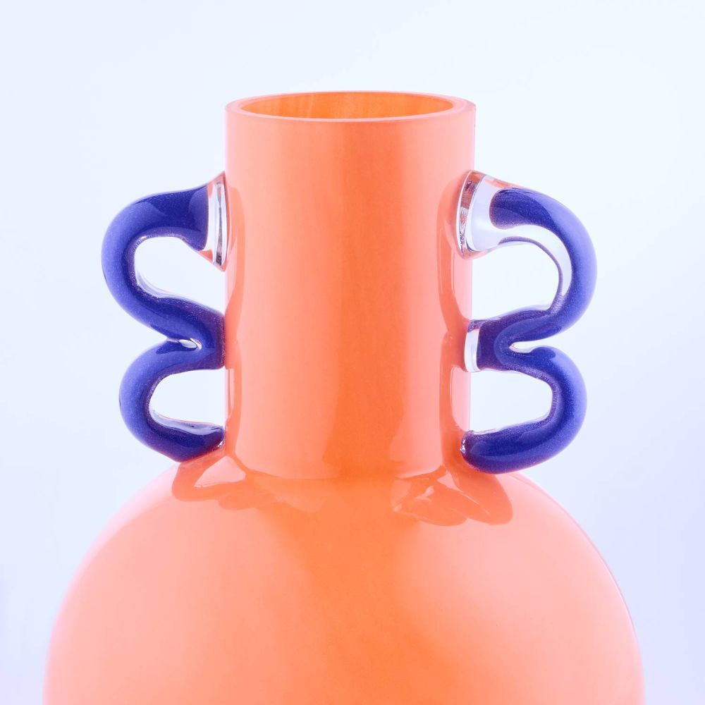 Το γυάλινο βάζο SLING διατίθεται σε έντονο πορτοκαλί και μπλε χρώμα με χρωματιστές λαβές. Αυτό το όμορφο γυάλινο βάζο φέρνει χρώμα στο σπίτι σας και αντιπροσωπεύει την αγάπη σας για τα αναζωογονητικά αξεσουάρ σπιτιού.