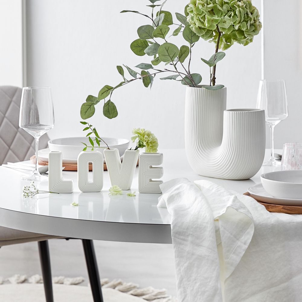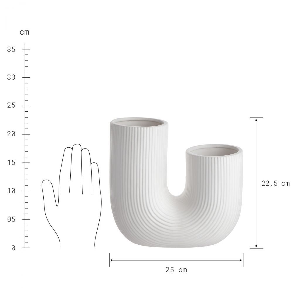 Το μοντέρνο κεραμικό βάζο TUBE από λευκό πηλό με δύο ανοίγματα και αυλακωτή επιφάνεια έχει ακριβώς το κατάλληλο μέγεθος για να ενσωματώνεται αρμονικά σε κάθε σημείο του σπιτιού όπως στο τραπέζι ή σε ένα διακοσμητικό δίσκο. Μπορείτε να τοποθετήσετε το βάζο ως μεμονωμένο κομμάτι ή να το συνδυάσετε με άλλα επιλεγμένα διακοσμητικά αντικείμενα. Στολίστε το χωρίς λουλούδια ή με αποξηραμένα κλαδιά, στον ίδιο τόνο ή δημιουργήστε όμορφες αντιθέσεις. Ένα διακοσμητικό αντικείμενο που είναι διαθέσιμο για όλες τις δημιουργικές σας ιδέες.