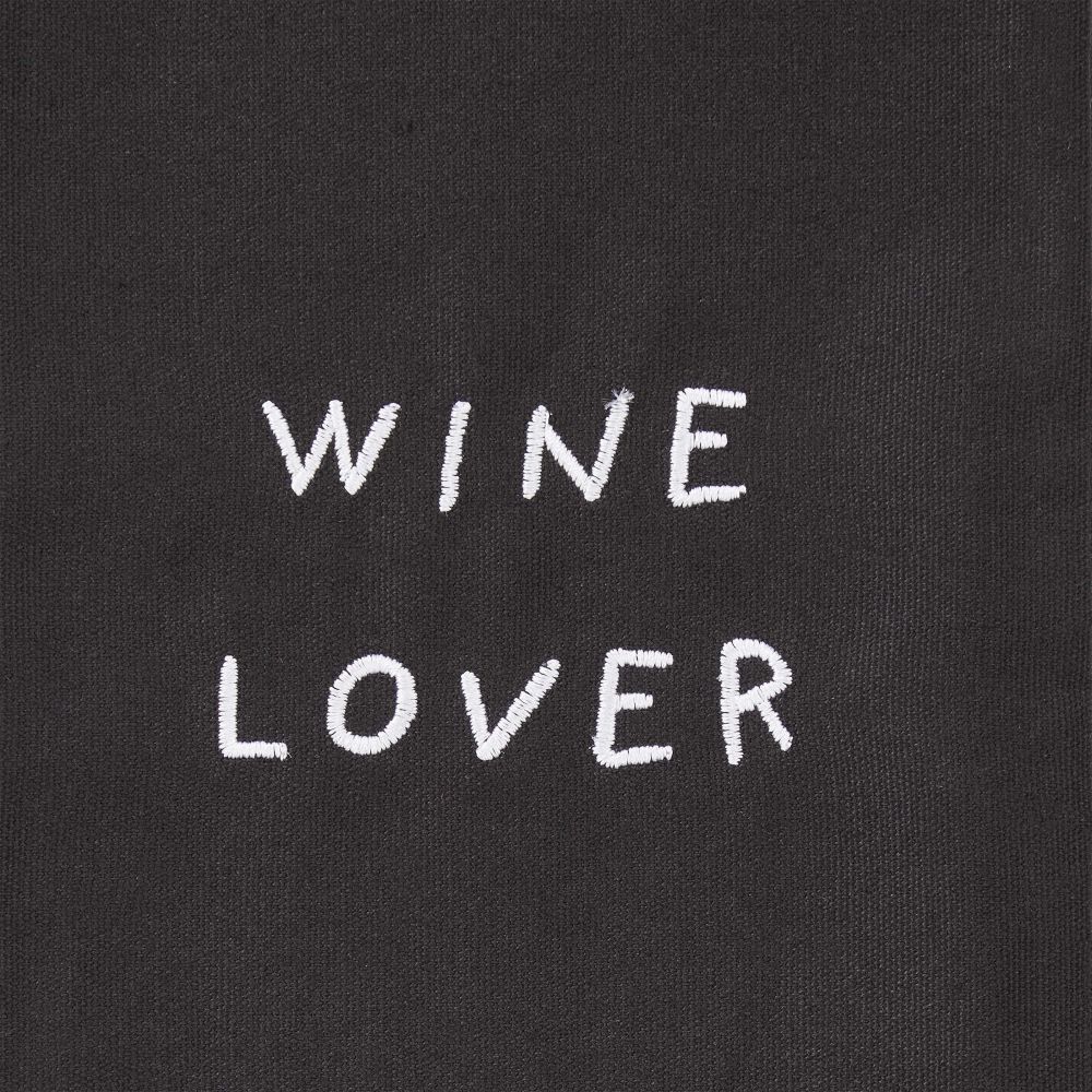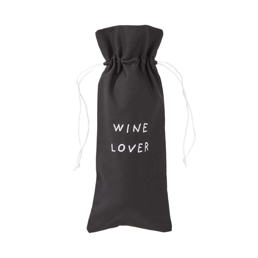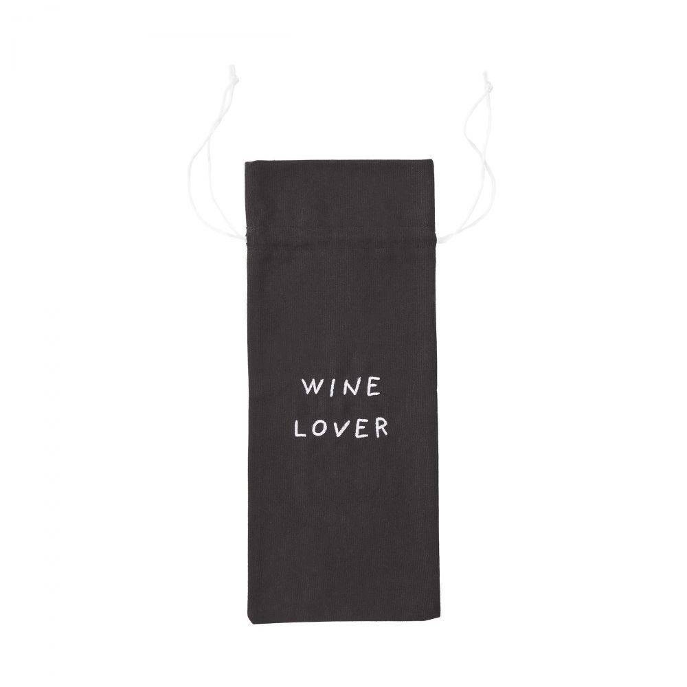 Με μια πρωτότυπη συσκευασία όπως η τσάντα μπουκαλιών WINE LOVER, ένα μπουκάλι λευκό ή κόκκινο κρασί γίνεται ένα προσωπικό δώρο. Η τσάντα από μαύρο βαμβάκι είναι διακοσμημένη με γράμματα και διαθέτει κορδέλα για να την τραβήξετε κλειστή. Επαναχρησιμοποιείται και επομένως κάνει καλό στο περιβάλλον. Διατίθεται σε δύο εκδόσεις.